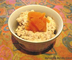 Add a pinch of salt, a little bit of good vanilla extract, a little almond extract and a couple of chopped dried apricots to 1/2 c old fashioned rolled oats and 3/4 c almond milk, and cook for about 5 minutes. Yum, yum, yum. Just another quick way of making vegan food that tastes good…Have a good day!