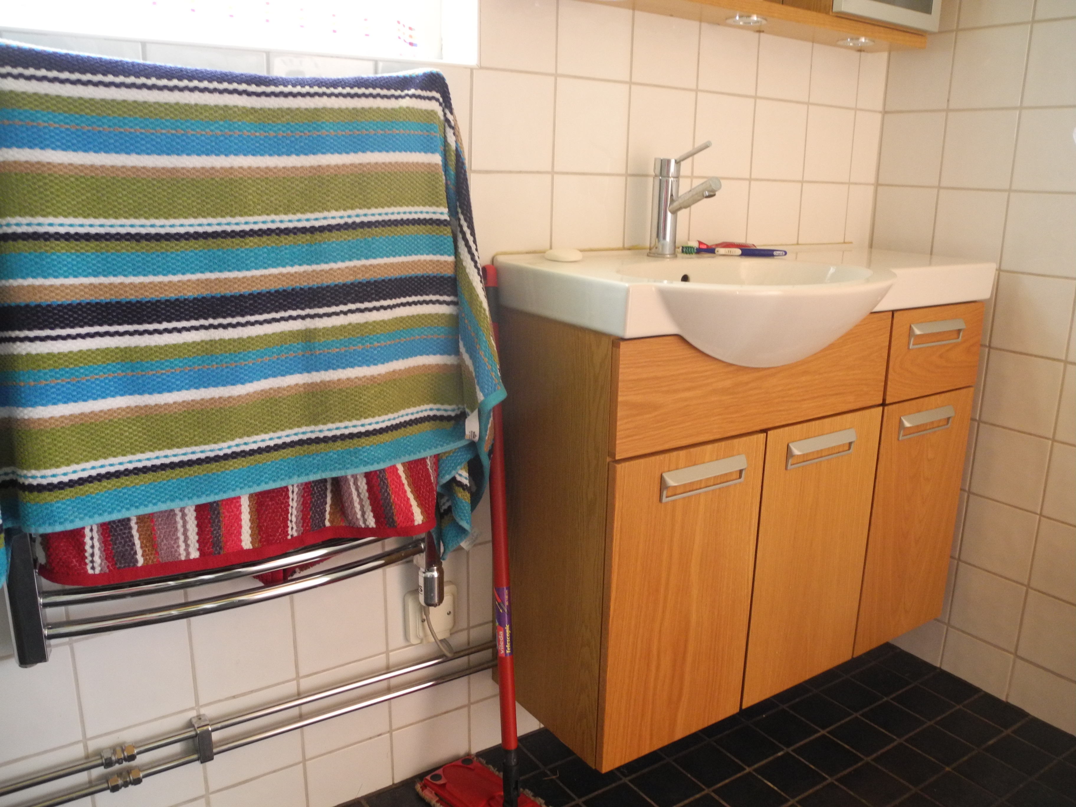 There’s a very good washing machine right next to the ‘loo. The shower has doors that swing in and out. They close really tightly when you go in to have a shower so the bathroom doesn’t get all soaked but tuck out of the way the rest of the time. There’s a drain in the middle of the floor which makes it súper easy to clean the whole floor really well. When you aren’t using the shower, it is very easy to load and unload the washing machine. And all the plumbing is out against the wall–maybe not really pretty, but sure beats frozen pipes in the brutal winters of Sweden.