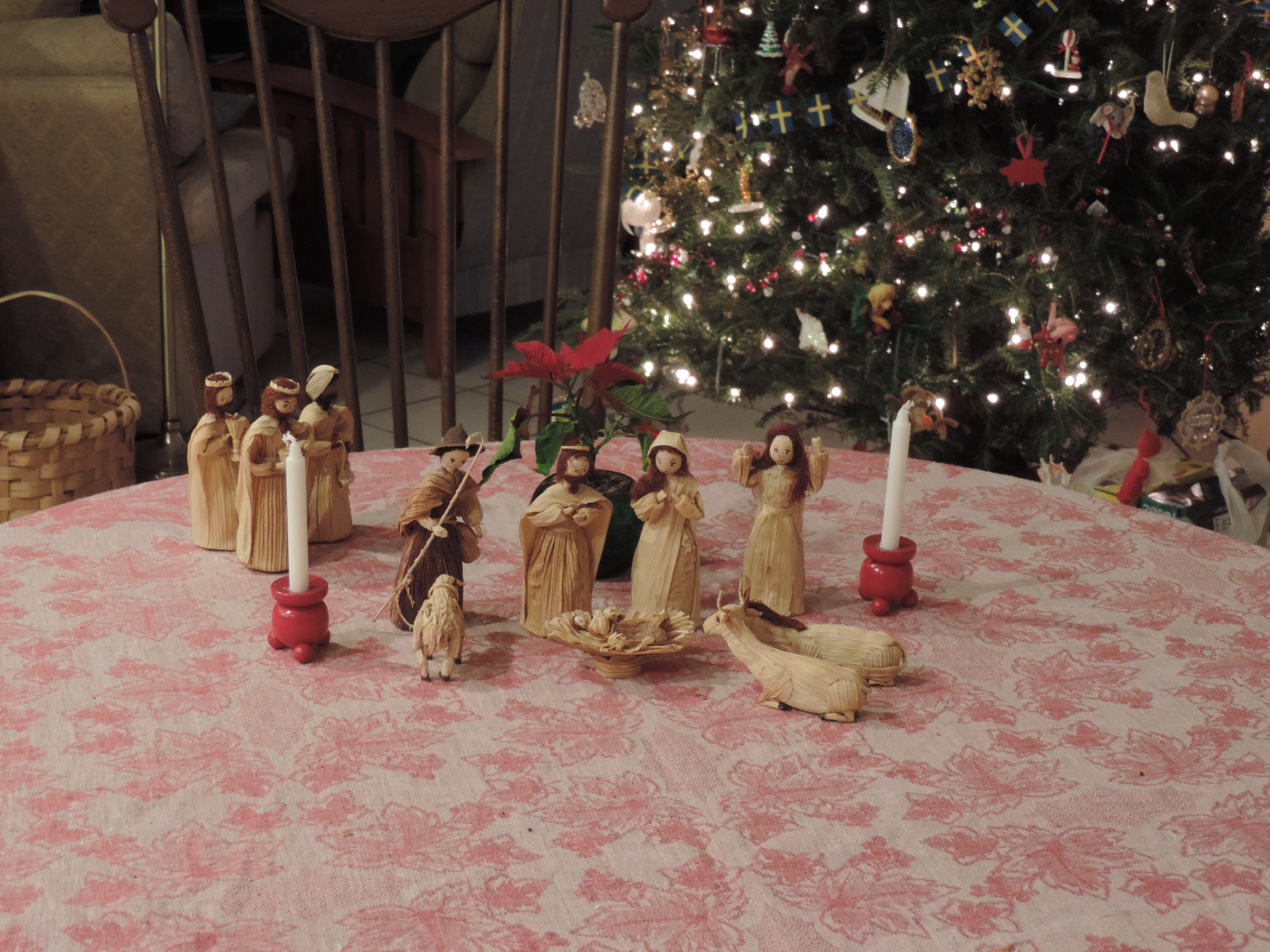 The house is sort-of a wreck and though this year, I managed to muster the energy to get a real Christmas tree, I had not put out any other decorations. When Sherod began to move towards fixing the first real meal of the day in the early evening, something went very quietly joyful in me. I pulled out the corn husk Nativity set one of my mom’s dear friends gave me shortly after we married. And a pair of Swedish candle sticks and candles that had been my mom’s. I polished some silverware and set the table. A Christmas table.