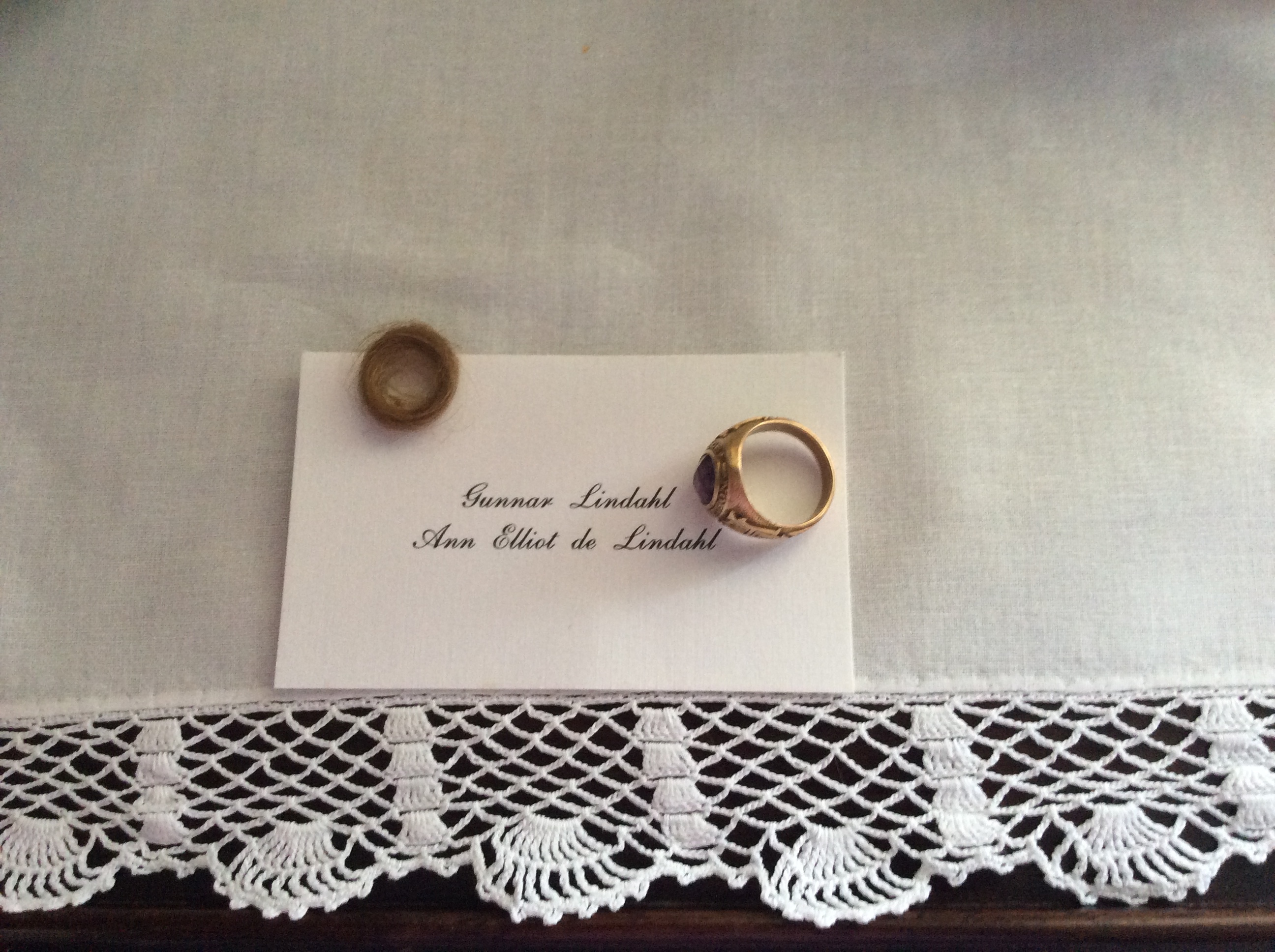 Of course there’s a part of me that wants to scoop up first one thing then another, mainly because so many have memories attached to them but also because my mother truly had exquisite taste.  Being surrounded by beautiful things was so important to her. I absorbed that without every having examined it consciously. Today there was almost nothing that tugged at me except these three things: my mother’s high school class ring. One of my parents’ engraved calling cards; theirs was such a proper time and place. A lock of hair that fell out from a small box, a lock of fine, soft hair that belonged to one of the three of us who were once her babies.