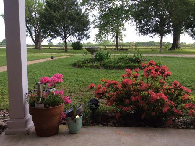 I sat out on our front porch this morning to drink my coffee. The azaleas are in full bloom and the pansies have not yet been done in by the heat. One of my antique roses has started to bloom as well. We’ve had rain most of the day since that early moment of tranquility but as soon as the rain ended, Sherod and I came back out to sit on the glider for a late afternoon visit.