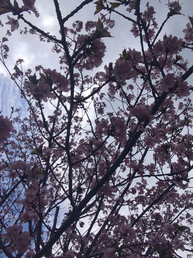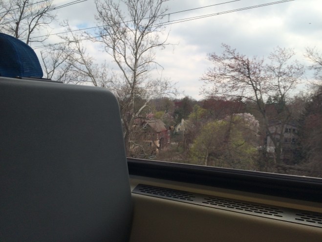 I don’t leave till after 7 tonight and I got done at 1 so it was easy to hop on a train to come see her. As I rode the train, I was enchanted by the forsythia, the tulip trees, and especially the old, pink cherry trees in full bloom up here. I kept thinking, “I am getting to follow spring” and even though the farm is so far into spring that the heat is giving us glimpses of summer already, seeing all this again, with lots of grey still visible, is a breathtaking experience of joy all over again. Michelle is having a quick meeting while I sit on a bench outside with all this beauty.