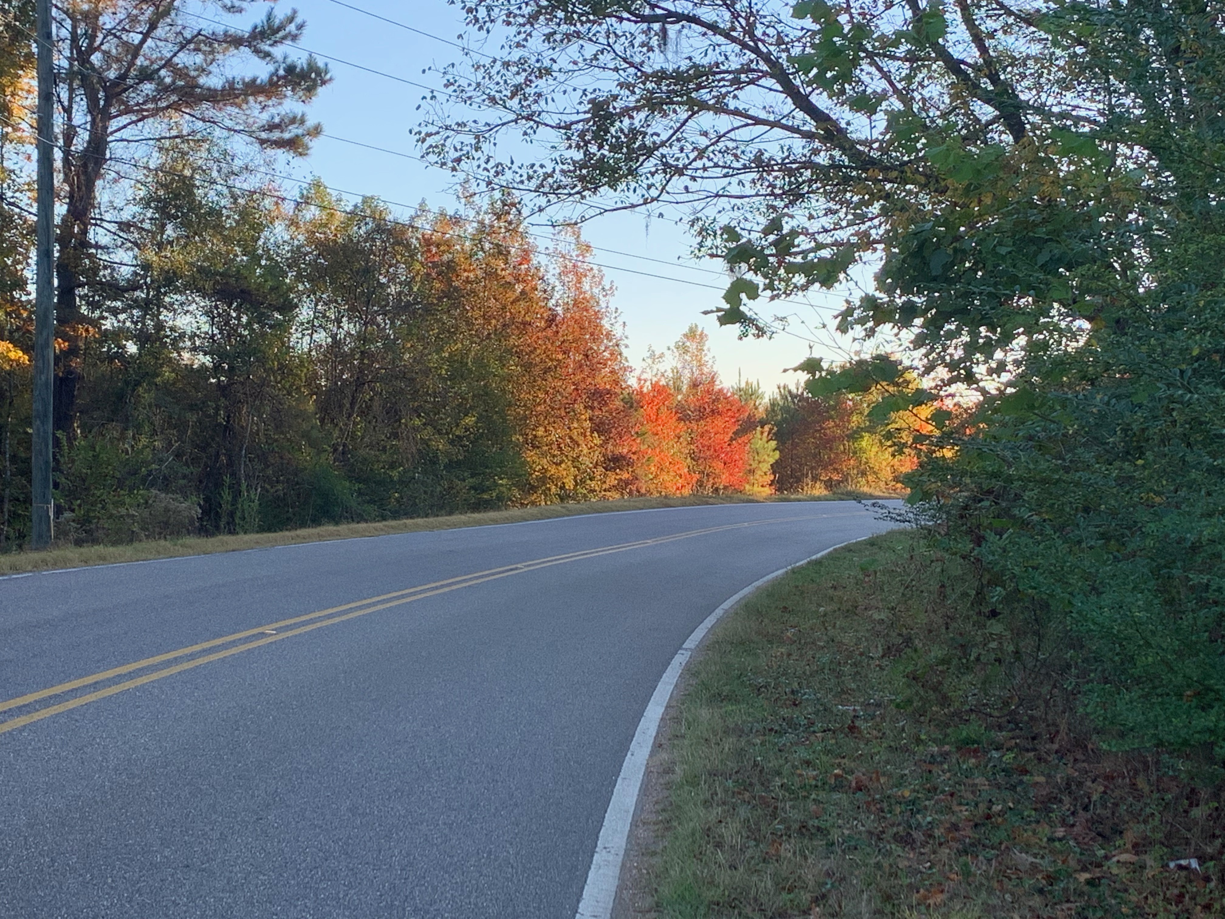 About 10 days ago we had couple of frosty nights. The kudzo is in retreat; that always pleases me. But what was really the very best, was the color that suddenly burst into flame. In the morning, when the light hits just right, you come around a curve on Old Selma Road, and I at least, just have to pull to the side. I came across a gorgeous line in a book review in the NYT this morning that says it perfectly: